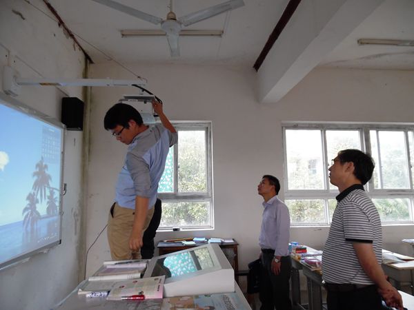 验收组一行在阙店中心学校相关人员的陪同下来到班级,查看“班班通”设备的安装使用情况,仔细检查了该设备从布线到相关仪器的配套情况,并指出存在的问题以及整改的方法。