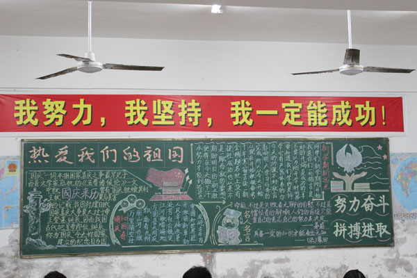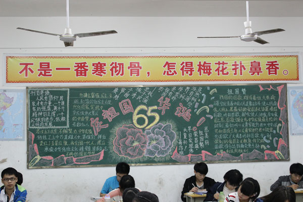 为了庆祝中华人民共和国成立65周年,加强对学生的爱国主义教育,增强庆祝国庆的浓厚氛围,美化班级文化环境。9月30日,千人桥中学开展了以“庆国庆”为主题的班级黑板报检查评比活动。