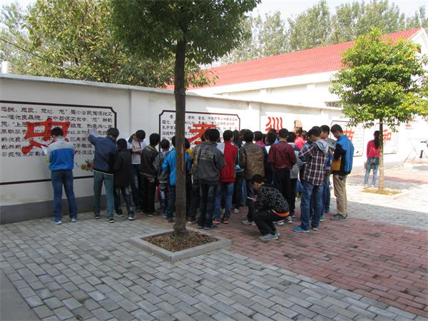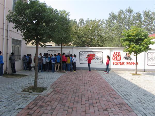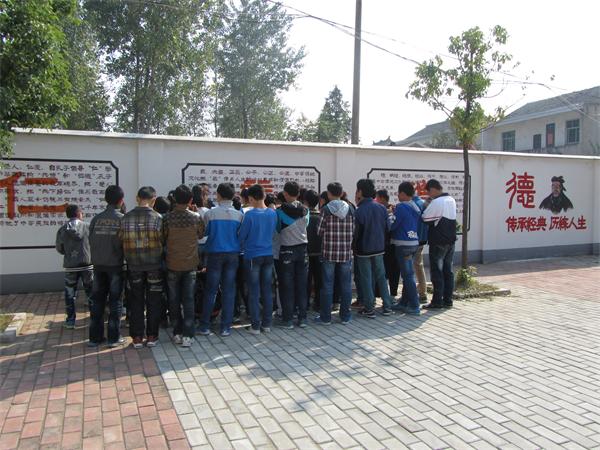 为了营造浓厚的校园氛围,“让每个角落都有色彩,每一面墙壁都会说话”。干汊河中心校在校园内设置了约60米的传统文化墙,将传统文化中的“仁、义、礼、智、信、忠、孝、节、勇、和”传统十德作为文化墙的内容,要求每个语文老师利用语文课带领学生现场感受文化墙的文化气息,教师对传统十德的内容要义进行认真详尽的解读评析,课后组织学生说感受、写心得,教师精选心得文章课堂点评,并在校园橱窗展示。
