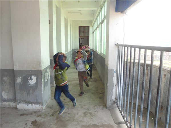 图为警报结束后学生在老师指挥下有序向安全地带疏散