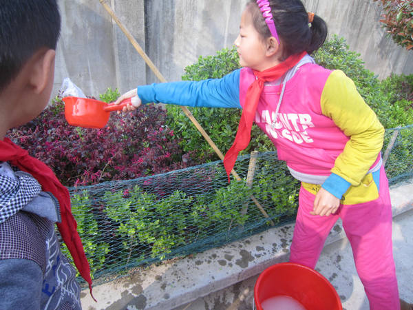孩子们正在用食堂洗菜淘米水浇灌树苗