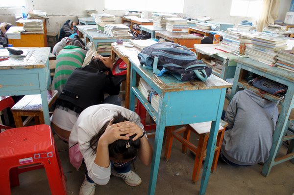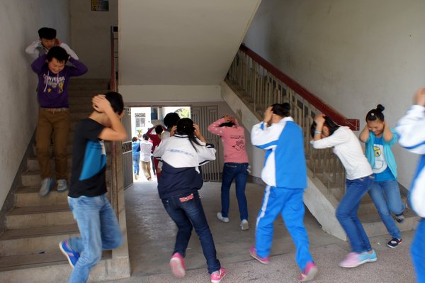 当日下午2点50分,该校地震警报器按响后,各个班级的学生按照老师辅导的防震知识要领,迅速钻进自己的课桌底下,抱头,蜷身,进行室内避震。当地震警报解除后,各年级的学生在老师的带领下,迅速而有秩序地疏散到指定的“安全地带”校园内操场,全校700多名师生仅用2分50秒时间,全部撤离教室,来到大操场。经过各年级班主任老师清点人数后,每个班级实到人数与上课出勤人数完全相符。