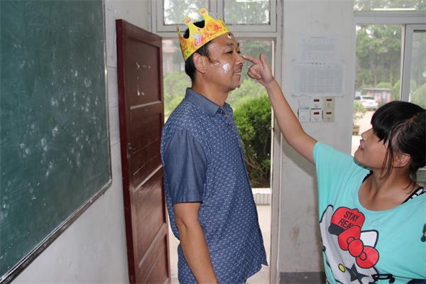 一位同学上前为亲爱的文老师戴上花环,大家变戏法般的拿出生日蛋糕,点上生日蜡烛,唱着生日歌,之后齐声说:“文老师生日快乐,我们爱你”!付文学同学给文老师送上蛋糕说:“文老师,生日快乐!”想想即将离校,有的同学眼睛红了-----,不过在这样的日子里,同学们可不想放过与老师亲近的机会,他们一个个都坏坏的将掺杂了浓浓的情、纯纯的爱的奶油往老师脸上涂,文老师呢,也一脸幸福地任由孩子们闹。
