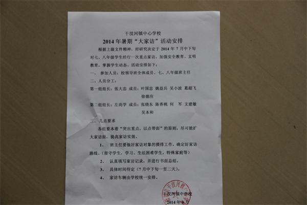 为落实上级主管部门有关文件精神,办好人民满意教育,强化学生及其家长安全意识,帮助学生策划假期生活安排,近日,干汊河中心校专门召开会议,对2014年暑期大家访活动进行了周密安排。
