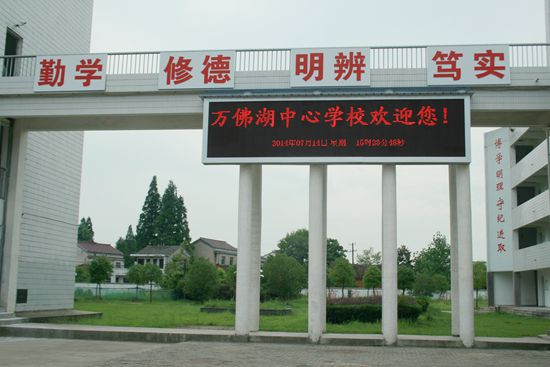 日前,万佛湖镇中心学校组织人员利用暑假期间在校园内书写永久标语,安装大型电子屏幕,旨在改善育人环境,加强学生思想品德教育,树立社会主义核心价值观。