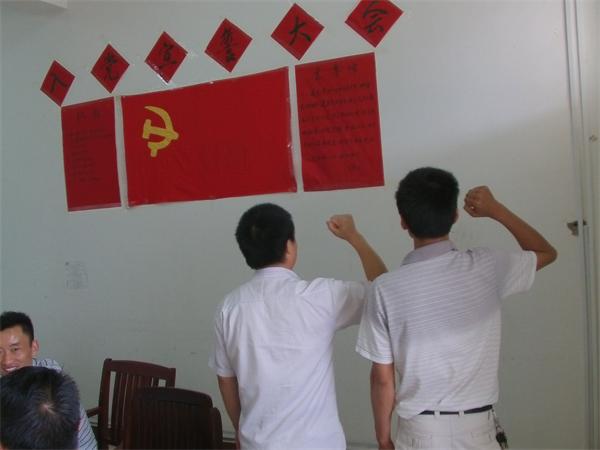 宣誓仪式开始,党员同志全体起立,会场上响起了高亢的《国际歌》声,随后,校党支部副书记郑重地宣读了上级党组织关于新吸收党员的批复文件,接着,新党员在老党员的带领下,高举右手,面对鲜艳的党旗进行庄严的宣誓,同时,老党员也与新党员一起重温了誓词。