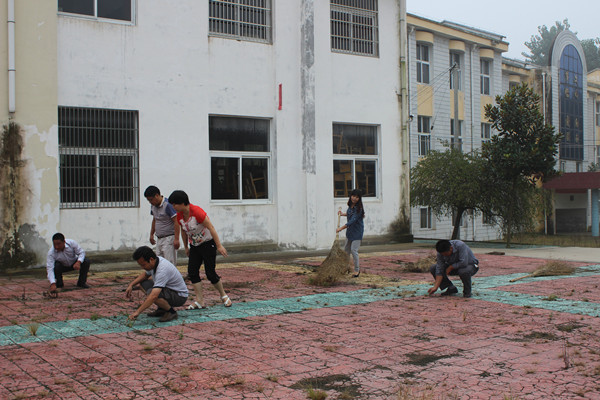会后,学校全体班子成员积极投入到清除学校大院杂草的工作之中。虽然暑期杂草生长快,长得密,但老师们冒高温,战酷暑,不怕脏,不叫累,经过一天的努力,终于把大院杂草清除干净,迎接新生的到来。