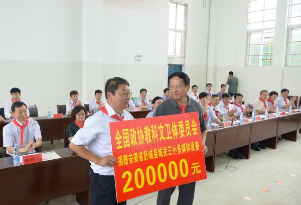 教师节慰问暨捐赠仪式由舒城县委副书记、县长张秀萍主持。舒城城关三小汤其林校长致欢迎词,他代表全体师生向各位领导、专家莅临城关三小表示欢迎,对全国政协教科文卫体委员会给予学校的支持和帮助表示衷心的感谢。全国政协委员、教科文卫体委员会委员、北京体育大学党委书记、校长杨桦作了捐赠发言。