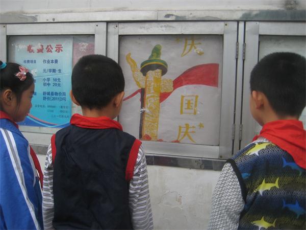 该校一贯注重加强青少年学生的爱国主义教育,从小培养孩子们爱祖国、爱民族、爱人民的思想情感。时值祖国65岁华诞的到来,学校以此为契机,在全体师生中进一步强化爱国主义教育。学校更新了以庆国庆为主题的宣传栏;召开了“做中华好少年”主题班会;布置了“中国梦 我的梦”板报;组织了校园卫生大扫除;开展了庄严的升旗仪式。