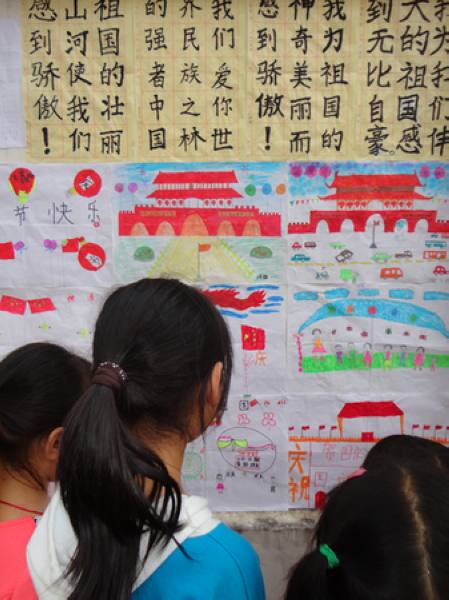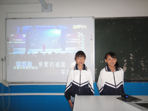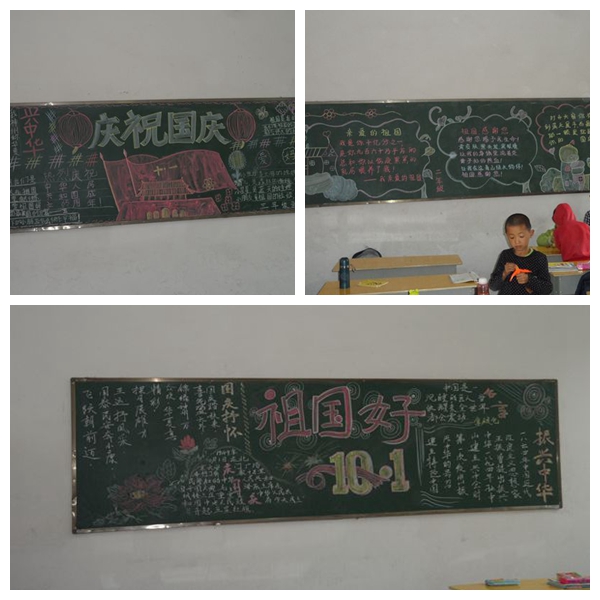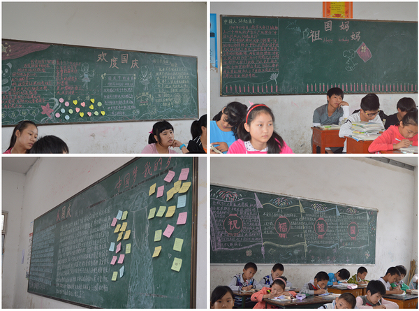 为迎接即将到来的建国65周年纪念日,在张母桥中心学校开展了以班级为单位的黑板报迎国庆活动。本次活动,受到全校广大师生热烈欢迎和广泛参与。在不到三天内,学校18个班级均完成了本班黑板报的设计与展示。各班黑板报国庆主题鲜明,版面图文并茂,且个性明显。