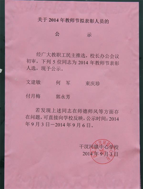 干汊河中心校本部模范教师评选公示