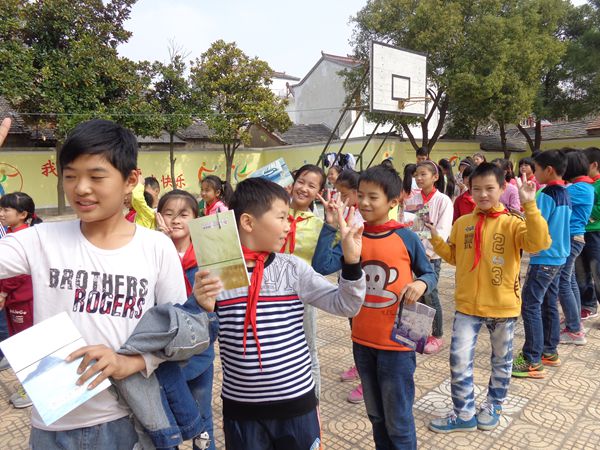 中午放学了,学生们依依不舍地与给他们带来温暖与快乐的大哥哥大姐姐们挥手告别。(李胜 特约通讯员:束永传)