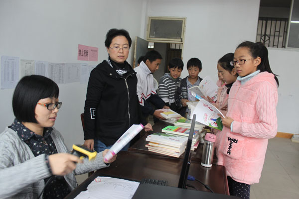 (图为2015年11月9日晓天中学图书管理员谢中静、段青两位老师为该校八年级学生借阅图书进行登记)