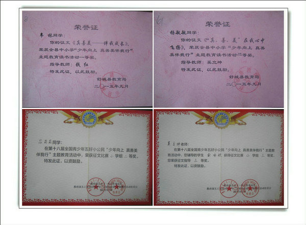 近日,山七镇中心小学吕萌萌、俞冰欣两位同学在第十八届全国青少年五好小公民“少年向上 真善美伴我行”主题教育征文比赛中,分别荣获部级二、三等奖,韦林、杨敏敏、方静怡在全县中小学“少年向上 真善美伴我行”主题教育征文比赛中,分别荣获县级一、二、三等奖,谢兴益、奚立坤、钱红分别荣获“优秀指导教师奖”。