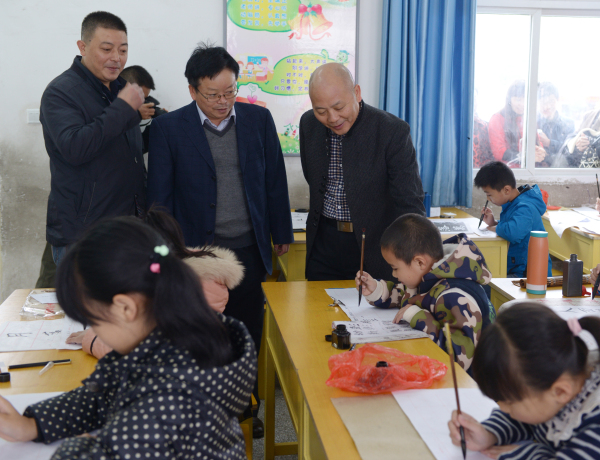 图为县教育局副局长王为勤(中)、副局长方志文(右)、县新华书店总经理朱传兵(左)查看学生比赛情况