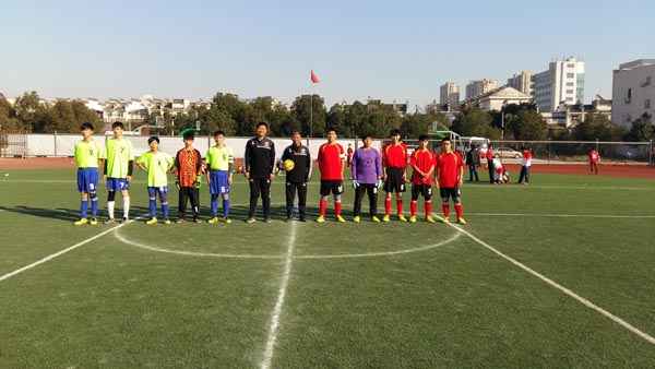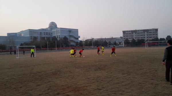 图二、与舒城一中学生足球队比赛中(红色队服)