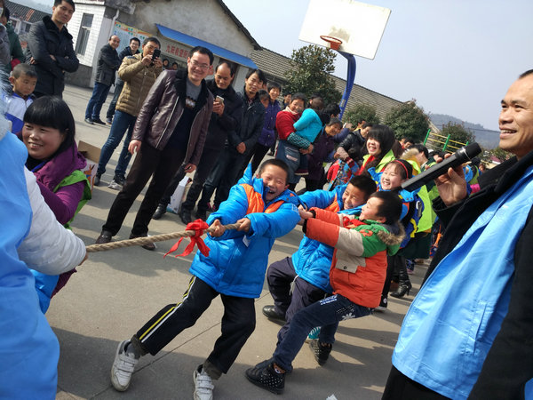 仪式在舒城好姨妈文艺宣传队表演的腰鼓舞和扇子舞中拉开序幕,山七镇镇长武立胜进行了致辞,舒城义工联合会负责同志简要进行了“壹基金温暖包”项目。随后,志愿者将温暖包现场发放给每位贫困儿童,亲手给他们穿戴好新棉衣、棉帽、围巾、手套、雪地靴,并送上可爱的小玩具,让孩子们深深感受到社会大家庭的温暖。最后,志愿者还和孩子们进行了一场激烈而精彩的拔河比赛和亲子游戏“小袋鼠”。县文明办储主任在讲话中感谢舒城义工及社会各界对贫困儿童的关爱;鼓励受助的孩子们积极面对生活中的不幸,树立自信,勇敢面对生活压力,希望孩子们能怀抱感恩之心,好好学习,立志成才,努力回报社会;同时希望各乡镇团委摸清贫困生家庭生活状况,积极争取社会力量对他们的资助,力争不让每个贫困儿童因贫失学,让浓浓爱心溢满社会各个角落。