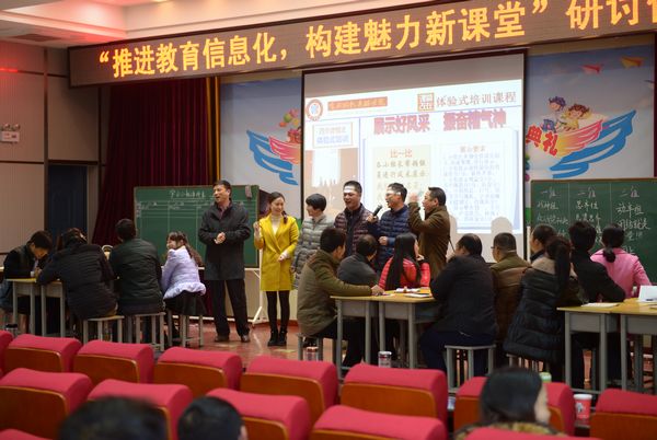 为进一步倡导新课改,打造高效课堂,推动教育教学全面发展,金太阳教育集团高级讲师、高级研究员乐金才老师进行了“推进教育信息化 构建魅力新课堂”专题讲座和体验式培训。乐老师以诙谐、幽默的语言和生动详实的事例对什么是高效课堂、为什么要构建高效课堂、如何构建高效课堂作了全面的阐述。随后由24位教师组建的临时班级的体验式培训,让参会教师对高效课堂教学获得了一种更为直观的感受,在具体的操作层面上对新课改课堂教学理念有了更为深刻的认识。