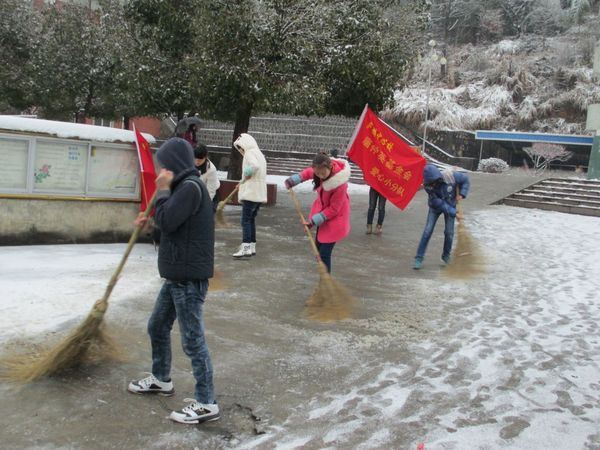 因1月27日普降大雪,28日早晨,庐镇中心校校园积雪,多处结冰。为确保校园道路畅通,保障师生安全,庐镇中心校唐仲英爱心小分队积极行动,在辅导员老师的带领下,队员们分工协作,在湿滑的斜坡、台阶路段设置警示牌,执勤疏导同学通过,用工具除雪。