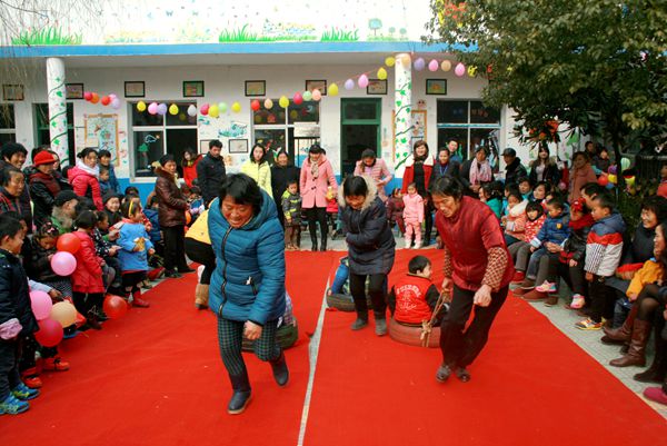 会后,该园以年级为单位,举办了全园迎新年、庆元旦、亲子游戏活动。亲子游戏是幼大班的小朋友在轻快、优美、悦耳的乐曲伴奏下进行优质早操表演中拉开了序幕。紧随着亲子游戏分别进行了《袋鼠跳跳跳》、《移石过河》、《爬大树》、《拉轮胎》、《推小车》、《快乐贴贴贴》、《穿大鞋》、《小脚踩大脚》、《快乐水功》、《盲人敲鼓》等10多个游戏节目。每场游戏做完均博得了在场观众的阵阵掌声。
