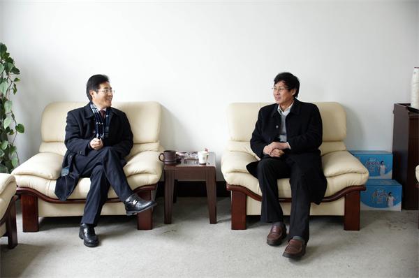 何登保校长(左)向李越教授(右)介绍舒中的办学情况