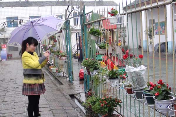 花卉种植活动是让每位幼儿护理一盆花,经常给它浇水, 白天端到室内装饰教室,晚上端出来露水,早晨孩子们一到幼儿园看到栅栏上一排排花卉,心情舒畅,家长们送孩子入园舍不得离开幼儿园,总想在此多看一眼。