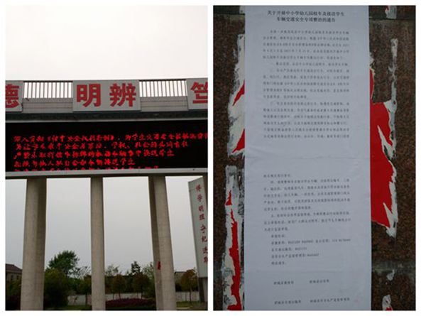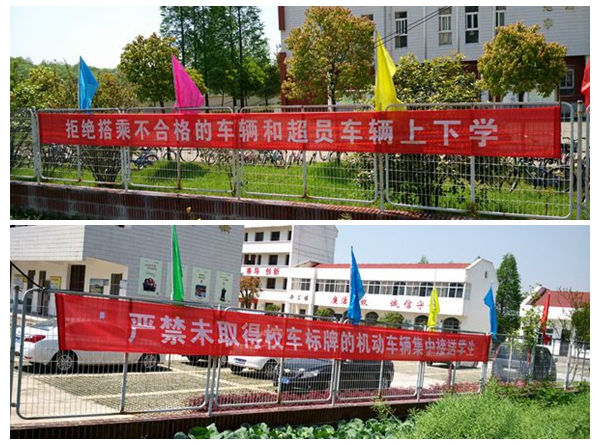 该校在校门口醒目位置张贴了《关于开展中小学幼儿园校车及接送学生车辆交通安全专项整治的通告》,在电子屏上滚动播放安全乘车常识,并在学生上学放学必经之地,悬挂了安全乘车宣传条幅。