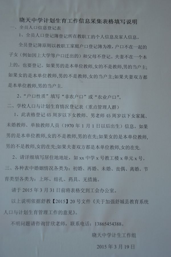 日前,晓天中学严格贯彻上级文件精神,认真做好计划生育信息采集统计工作。学校安排该校团支部书记专人领导,专事专办。学校在签到处张贴计生信息采集宣传文件,印制《计划生育信息采集登记表》,并分发到每位教工手中,3月31日,学校还召开全体教职工大会,专门就教师计生政策和《计划生育信息采集登记表》填写注意事项作详细说明。