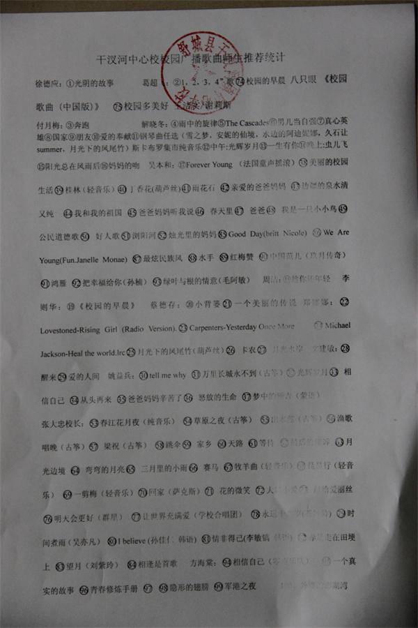 为全面贯彻党的教育方针,落实教育部《学校艺术教育工作规程》的要求,凝聚校园文化,日前,干汊河中心校在全体师生中公开征集并筛选了100首校园歌曲,将用于学校校园广播的播放,每天10首,一月一轮换。