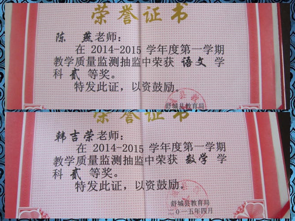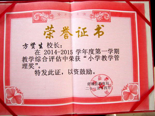 在刚刚结束的“全县义务教育质量监测表彰暨教学教研工作大会”上,万佛湖镇九井小学四年级在2014—2015学年度第一学期期末质量监测抽监中取得优异成绩。九井小学荣获“教育教学成果奖”,校长方贤生荣获“小学教学管理奖”,陈燕、韩吉荣两位老师荣获语数单科成绩二等奖,县教育局分别给予校长和两位老师颁发了荣誉证书和奖金。