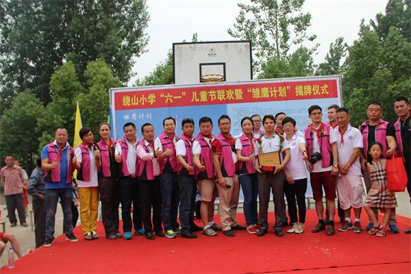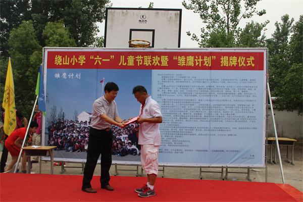 清华大学创新管理与成长模式实战班120299班的班长与绕山小学校长叶少廷共同为“雏鹰计划”揭牌,李春明先生(小学、初中曾就读于该小学,一直关心、支持母校的发展,其为关爱家乡孩子们健康成长而与清华大学创新管理与成长模式实战班120299班的同学倡议设立“雏鹰计划”)宣布“雏鹰计划”正式开始,向绕山小学捐资十万元,用于该小学的教育教学条件的改善。向全体同学每人捐赠春夏两套校服和一个饮水杯,作为节日的礼物。中心校校长张大忠代表中心校向李春明先生及清华大学创新管理与成长模式实战班120299班全体同学表示深深的感谢,并为李春明先生颁发绕山小学荣誉校长聘书。