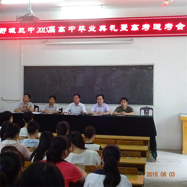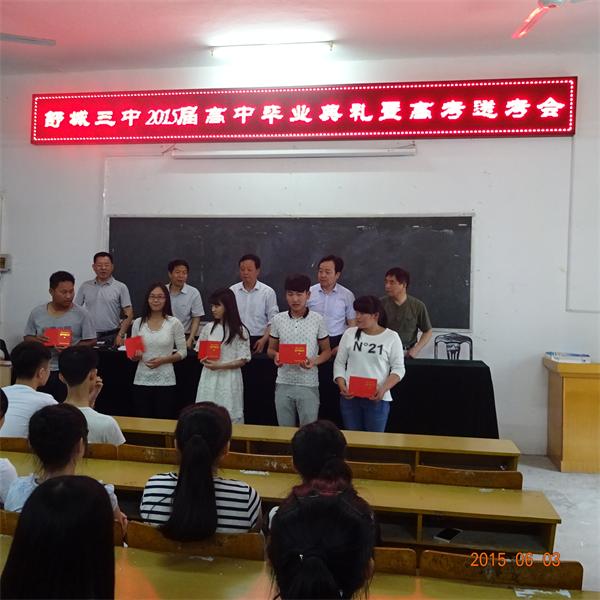 6月3日下午4点, 舒城职高(三中)隆重举行了“难忘母校,感谢恩师,惜别同窗”2015届学生毕业典礼。出席典礼的有:舒城三中校级领导班子成员、教导处主任、高三年级全体师生。