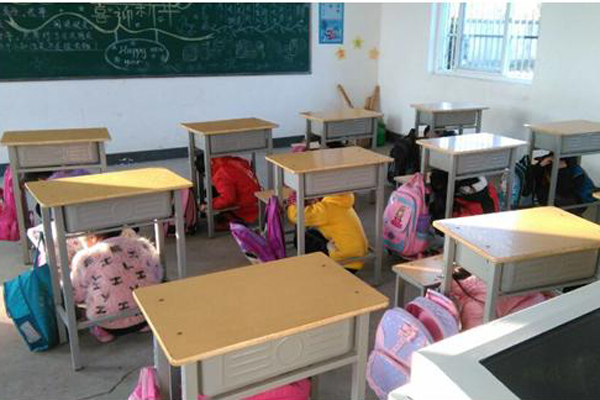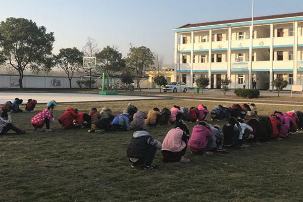 只听急促的警报声响彻校园,教师指导同学们按照要求护住头部,迅速蹲到课桌底下。