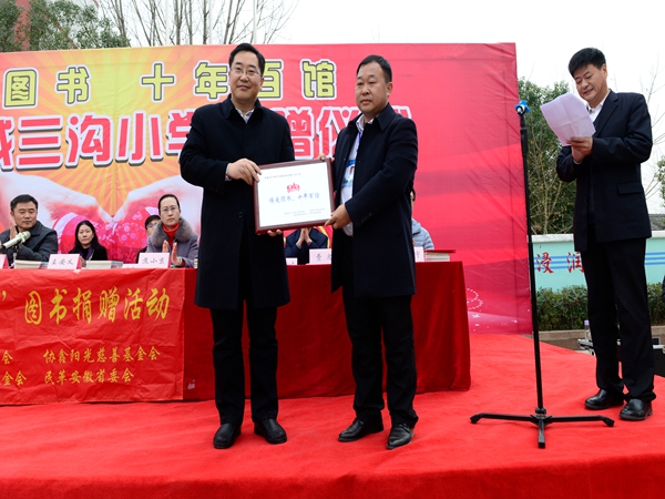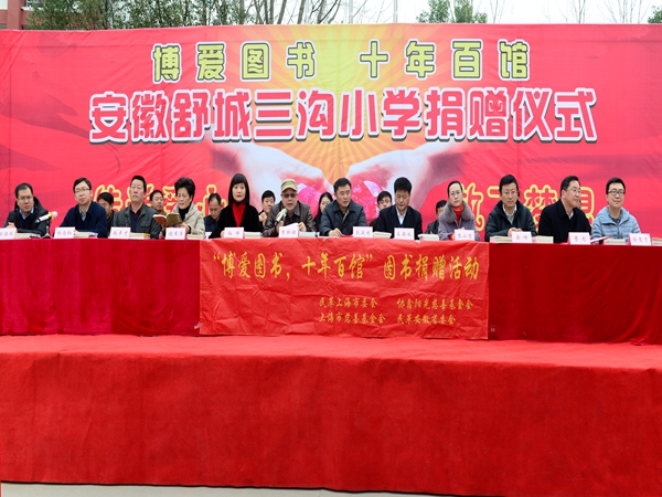 12月19日下午,上海市政协常委、民革上海市委副主委李栋樑,协鑫集团执行总裁、协鑫阳光慈善基金会主席孙玮一行到安徽舒城桃溪镇三沟小学开展“博爱图书、十年百馆”图书捐赠活动。安徽省政协副秘书长、常委、民革安徽省委专职副主委吴延利,舒城县委副书记、县长张秀萍,县委常委、统战部长杨丙红,副县长张海鸿等领导和县委统战部常务副部长周增云、县教育局局长朱传友等陪同,六安市副市长、民革六安市委主委王安义主持捐赠仪式。
