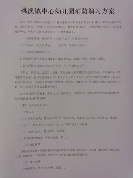 为了认真落实《舒城县教育系统今冬明春火灾防控工作方案》的文件精神,做好消防工作,防止火灾发生,12月27日,桃溪镇中心幼儿园全体师生开展了“防火灾应急疏散演练”活动。