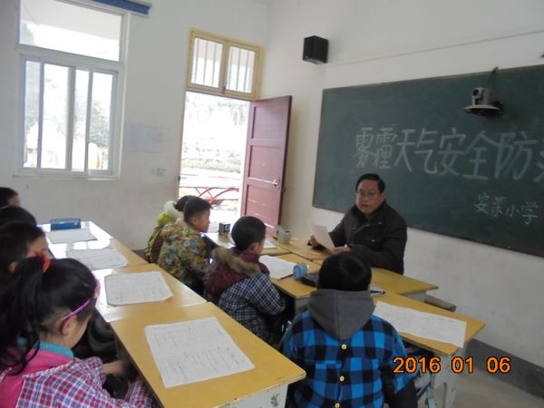 连日来雾霾天气较多,道路能见度降低,空气污染物增多,对学生的身体健康和上下学交通安全产生了较大的影响。为切实做好学生的安全工作,近日庐镇乡安菜小学多措并举开展雾霾天气安全防范教育。