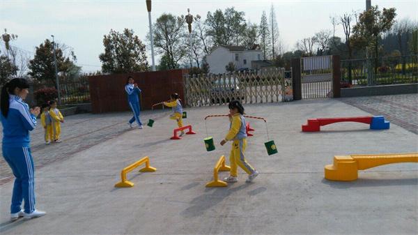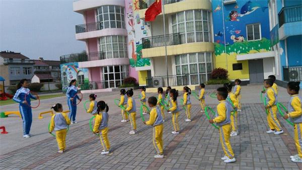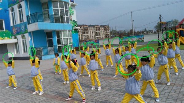 小朋友们在节奏明快的《数鸭子》音乐声中开始,他们身着统一服装,排着整齐的队伍,精神饱满地走进场,在富有进行曲风格的乐曲声中进行着队形变换,接着,他们手拿彩圈,在两位大班老师的带领下做起了融合趣味性和表演性于一起的轻器械操。随后,他们情绪高昂地玩起了创意游戏“挑水赛”。活动在舒缓的乐曲中轻松结束。