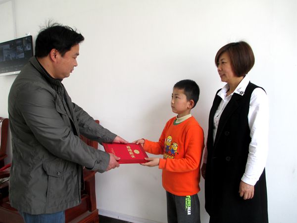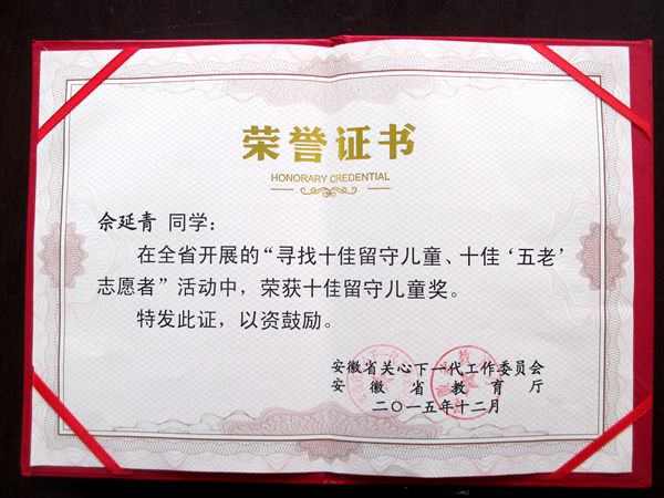 万佛湖镇中心学校分校四(1)班学生佘延青荣获全省首届“十佳留守儿童”称号。4月11日,佘延青同学从校长周家存手中高兴地接过一本由省关工委、省教育厅联合颁发的大红色荣誉证书。