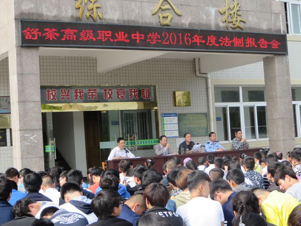 5月10日下午,舒茶职高全体师生集聚到校综合楼惜时广场参加2016年度法制报告会。