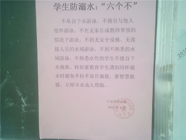 各班主任精心制作主题班会课件,播放《珍爱生命,远离溺水危害》PPT,通过一个个真实鲜活的案例,震撼学生的心灵,提高其防患于未然的意识,让其了解必要的自救方法,并向学生郑重地发出“防溺水,六个不”倡议书。在班级张贴“防溺水”宣传标语,利用校广播站普及“防溺水”常识,由团总支牵头,组织各年级学生绘制“防溺水”安全教育主题黑板报,举行“防溺水”知识竞赛等,营造了浓厚的“防溺水”安全宣传教育氛围,使学生进一步提高“防溺水”的安全意识和技能。(姚益兵 特约通讯员:吴本和)