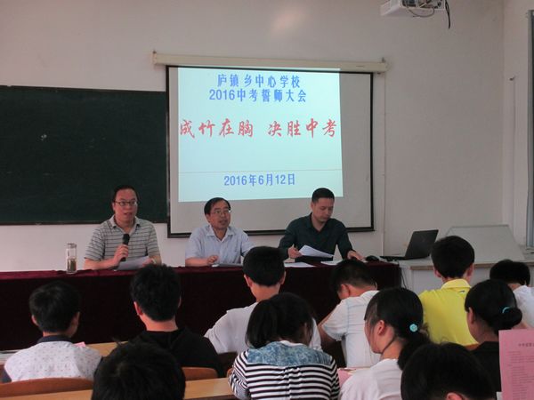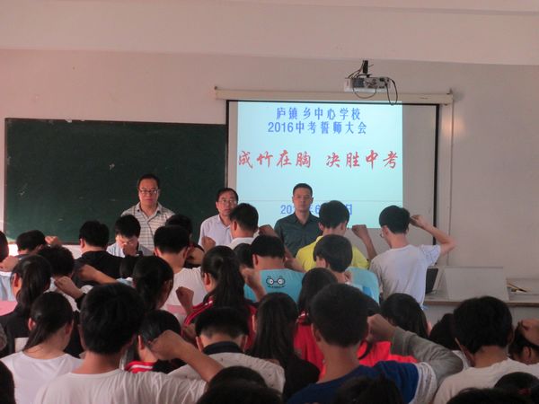 为鼓舞毕业班考生的士气,确保中考期间的师生安全,庐镇乡中心学校与6月12日下午隆重召开“成竹在胸 决胜中考”2016年中考誓师大会。