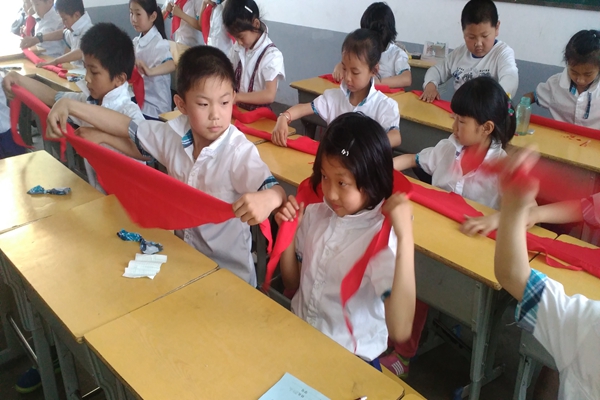仪式结束,各个新队员胸前都飘起了鲜艳的红领巾,每个人的脸上都洋溢着幸福、自豪的笑容。(周先兵 特约通讯员:钟礼荣)