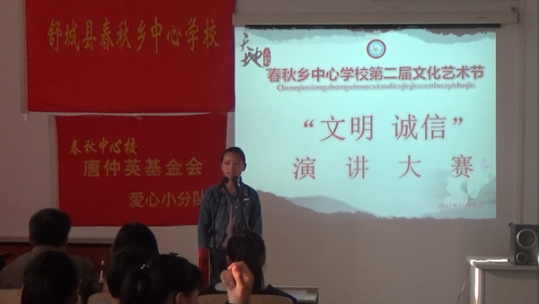 为进一步丰富校园文化生活,活跃校园气氛,促进学校均衡发展优质提升,践行社会主义核心价值观,春秋乡中心学校自2017年11月底开始,陆续举办以“养德·育能·明心”为主题的第二节校园文化艺术节系列活动。11月27日下午,在该校多媒体教室内,隆重的第二届文化艺术节拉开帷幕——“文明·诚信”演讲大赛