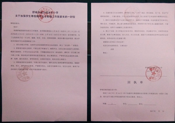最后,该校负责人要求全体同学以身边优秀的同学为榜样,比学赶超,利用寒假时间补缺补差,力争在新的一年各方面表现都能取得更大进步。同时,该校还印发了《城关镇永安小学关于加强学生寒假期间安全管理工作致家长的一封信》,该校负责人在会上对全体师生进行了交通安全、饮食卫生、防烟花爆竹伤害、防火防电、防煤气中毒、防寒保暖等安全教育,要求所有师生制定合理的寒假生活、学习计划,坚持体育锻炼,祝愿全体师生都能过一个文明、健康、欢乐、祥和的春节。(王泽祥 特约通讯员:张志刚)