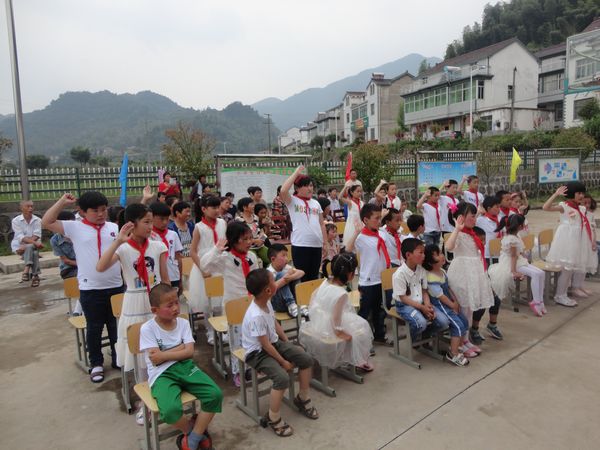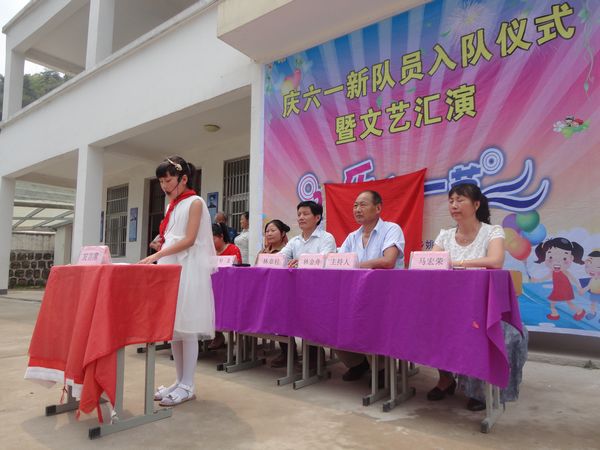 入队仪式在庄严地国歌声中开始,在伴随着嘹亮的《中国少年先锋队队歌》中出旗,紧接着七名新队员们佩戴着鲜艳的红领巾在鲜红的队旗下举起右手庄严宣誓。新队员代表、老队员代表分别讲话,新任大队长作就职演讲,辅导员老师致辞,校长作总结讲话。仪式上还通报表彰了在“迎六一书画大赛”中获奖选手。