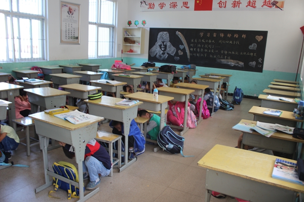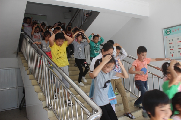 上午9时18分随着第一声警报响起,按预定方案,全校近300名学生,在学校的统一指挥和教师的正确引导下,迅速抱头钻进桌底。紧接着第二声警报响起,同学们分别从教室快速撤离。1分58秒后师生安全、有序地撤离到安全地带,束校长询问各班实到人数,并对同学们进行爱国主义教育,带领同学们高呼“勿忘国耻!爱我中华!”呼喊声响彻校园。演练达到了预期目标,获得了圆满成功。演练结束后,学校有针对性地做了总结,并提出了演练中存在的不足。