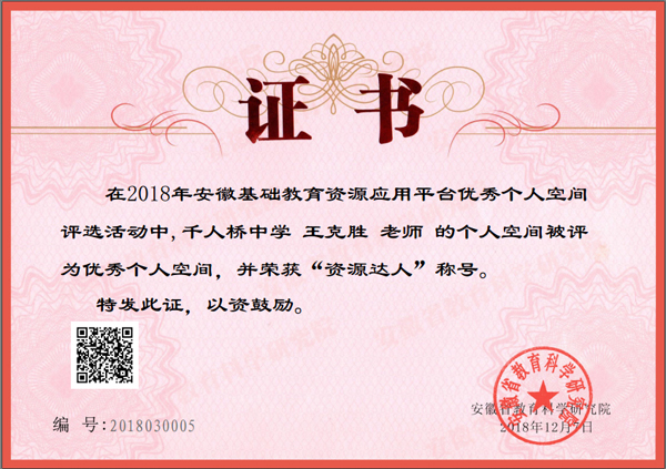本次安徽省优秀个人空间评比由安徽省教科院组织,根据《关于开展安徽基础教育资源应用平台优秀个人空间评选活动的通知》(皖教科研函〔2018〕14号)文件要求,评选活动从2018年7月启动,经过县、市级推荐、空间展示、省级评选、网上公示等程序。最终,王克胜名师工作室个人空间不负众望,以较强实力,经过层层选拔,获此殊荣,成为全省110个“优秀个人空间”之一。