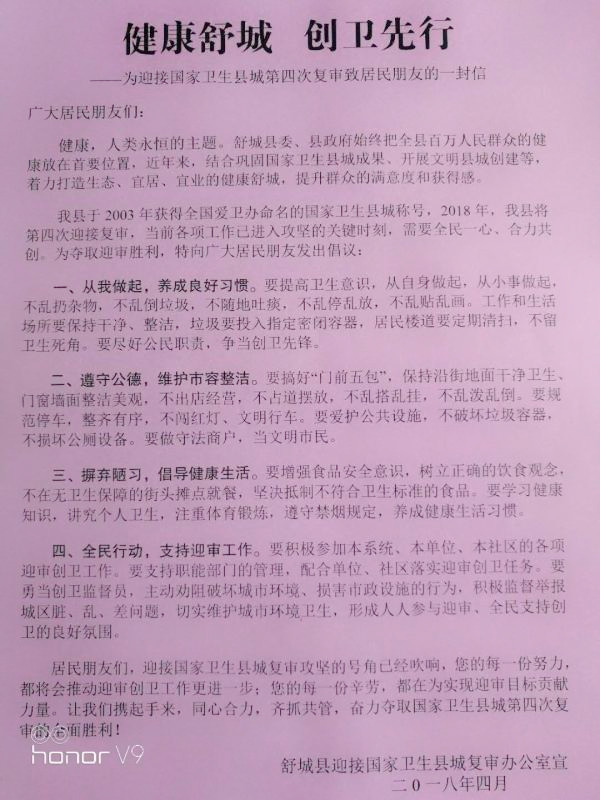 加大宣传力度,营造浓厚氛围。学校通过电子显示屏、条幅等“创卫”宣传标语,营造浓厚的“创卫”氛围;各班开展以“文明创卫”为主题的班会,加强学生对创卫工作的认识;各班组织编绘“我为创卫出份力”为主题的手抄报,结合健康知识问答、低碳环保等内容,充分发挥各自的优势,把对创卫的理解、认识和期望融入到手抄报中;向师生和家长发放“健康舒城,创卫先行”的一封信,讲解“创卫”的目的、意义和要求。