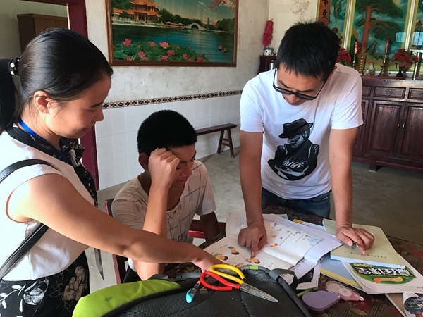 顾不上休息,送教小组又马不停蹄地来到金安区东河口镇南官亭村的梁某家。梁某还像往常一样,在家帮爸爸看超市,谁来买东西就高兴地把钱收下。看见主教王欢老师,就迫不及待地拿出自己的作业给王老师看,直问:“老师,我写得好不好?”“很棒!非常好!”听到老师表扬,开心地哈哈大笑。随后,王老师给梁某上了两节她最喜欢的手工课。小心翼翼地撕、仔细地粘贴,在老师的指导下,一幅幅美丽的手工作品很快就完成啦!最后老师和孩子一起把手工作品贴在墙上,此时的梁某无比幸福快乐!