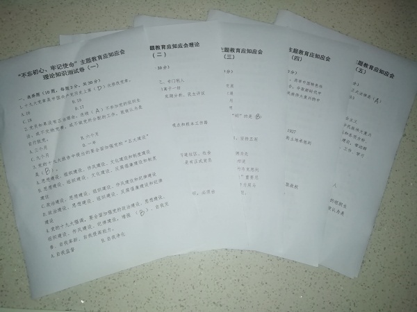 10月21日,该校党支部要求全体党员参加《“不忘初心、牢记使命”主题教育应知应会理论知识测试卷(第2~5套)》测试。10月23日,全体党员将做完的测试卷交给党小组长,然后三位党小组长与宣传委员姚名林共同做出参考答案,再批阅全体党员测试卷,最后将测试成绩报宣传委员汇总,再上报干汊河中心校党总支部。